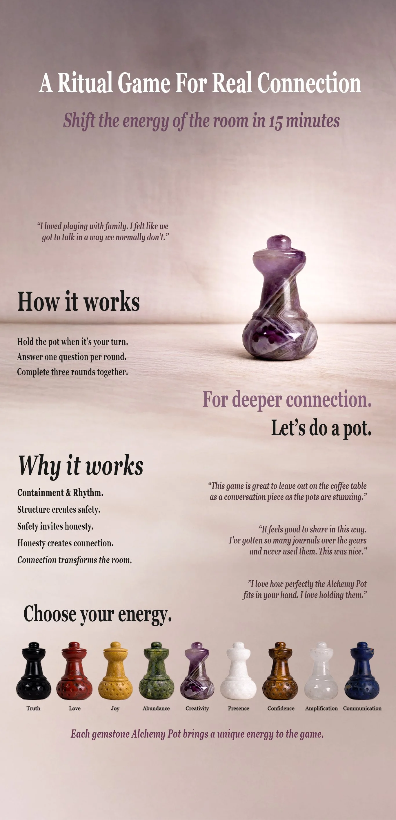 Start The Ritual Shop the Collection TruthBlack Obsidian Sold Out PresenceWhite Marble Sold Out AbundanceGreen Jade Buy Now JoyYellow Jade Buy Now CreativityPurple Amethyst Buy Now LoveRed Jasper Buy Now Create space for connection between parents and children, friends and families, and people you love.
